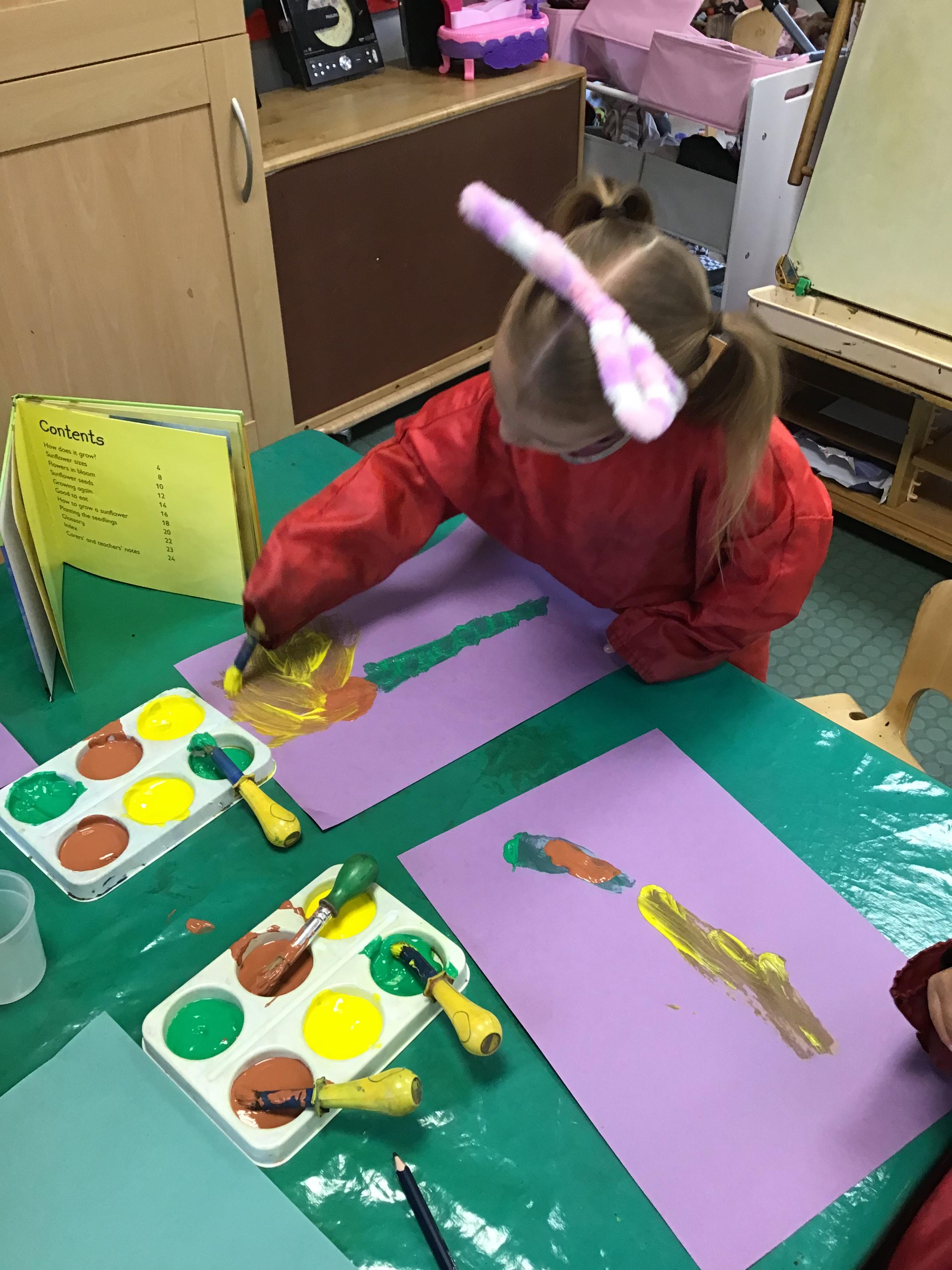 Next, the focus turned to seeds and plants, and the story ‘Sam Plants a Sunflower’ inspired the planting of sunflower seeds and cress. The children painted some impressive sunflowers which helped to decorate the nursery.