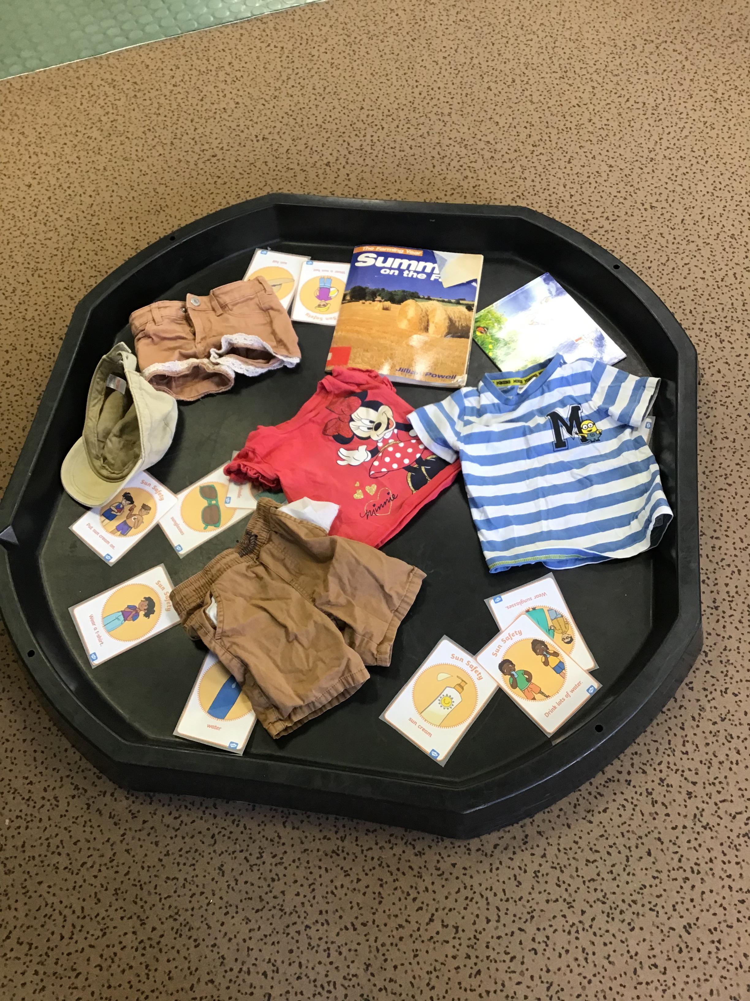 The children then learnt about sun safety, which was timely with the improvement of the weather! They sang a song to help them to remember where to put sunscreen and explored different kinds of clothing to wear for protection too.