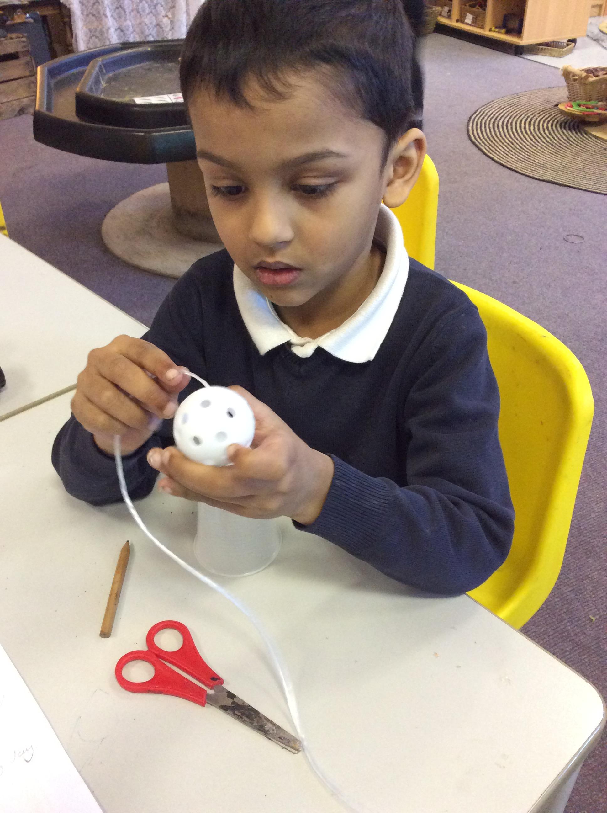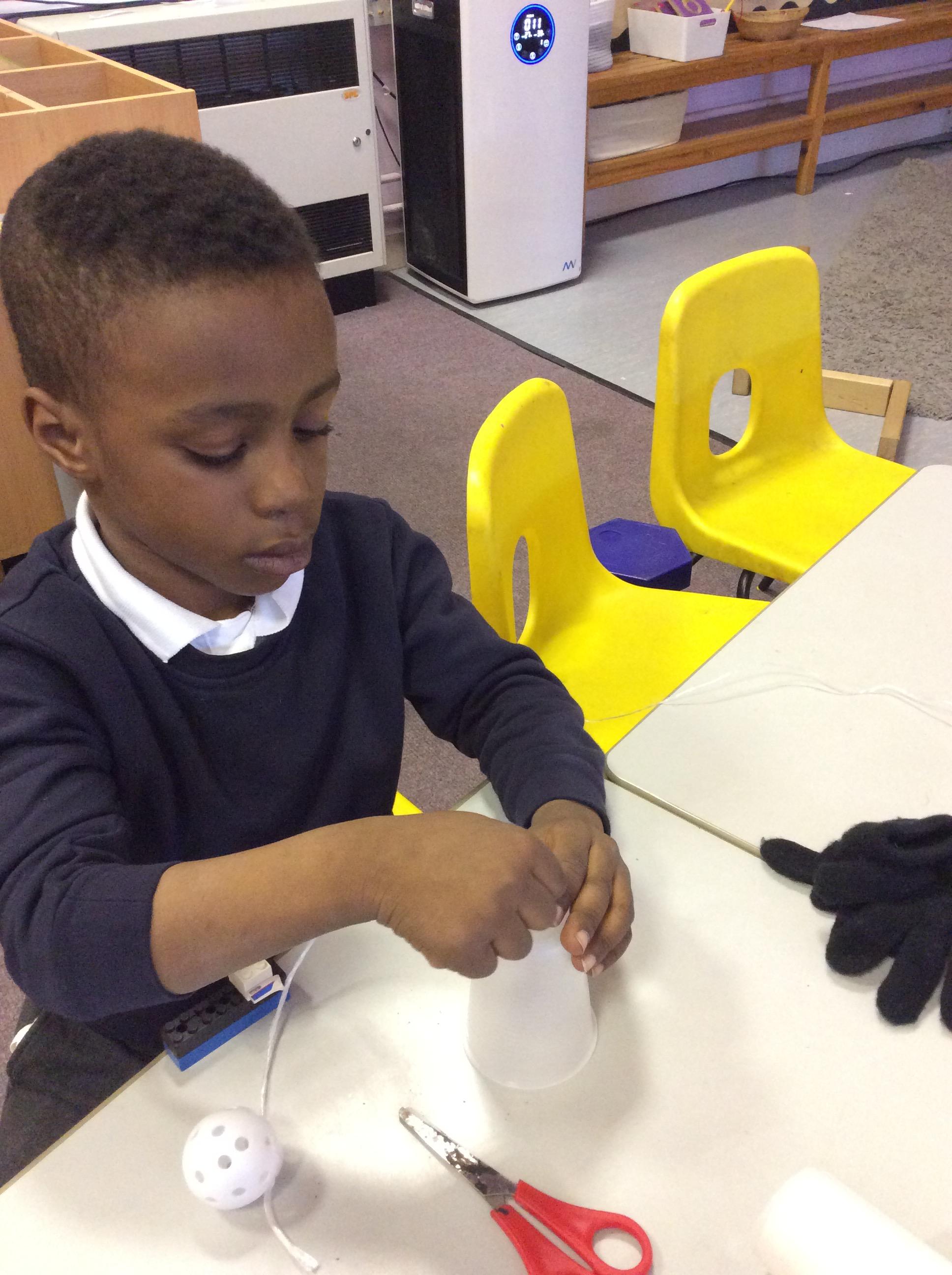 In our classroom, our teachers bought in some very unusual looking things that they told us were ‘toys’ only they didn’t look like the toys that we are used to playing with.  We had fun making our very own ‘cup and ball game’ – which was very tricky to play!