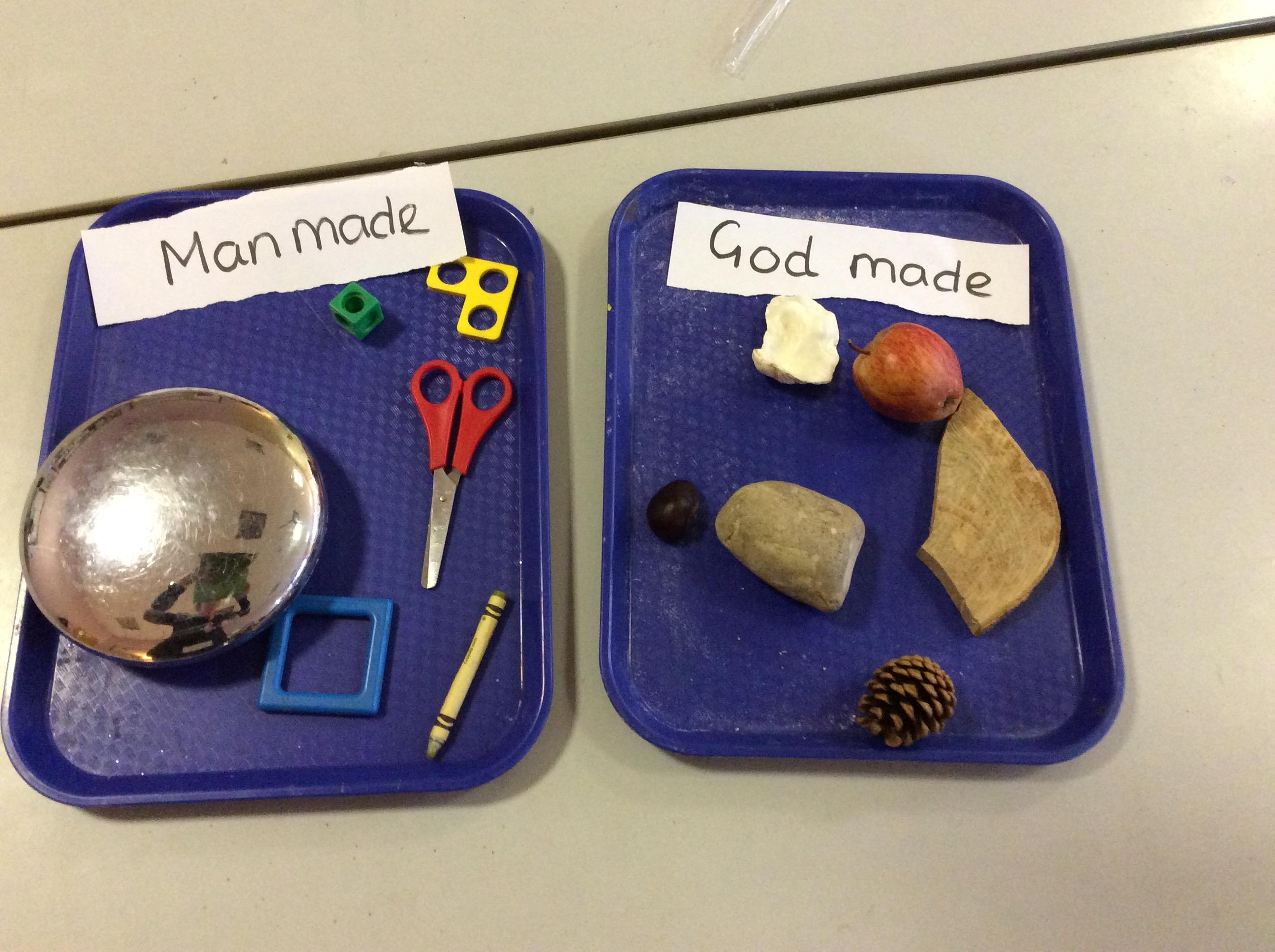 Another story that enjoyed from long ago was the Creation Story.  We heard about how the world was made and that it took God only 6 days and then he had rest on day 7.  We classified objects into 2 groups, God Made and Man Made – did you know a pine cone is made by God, because it comes from a tree…