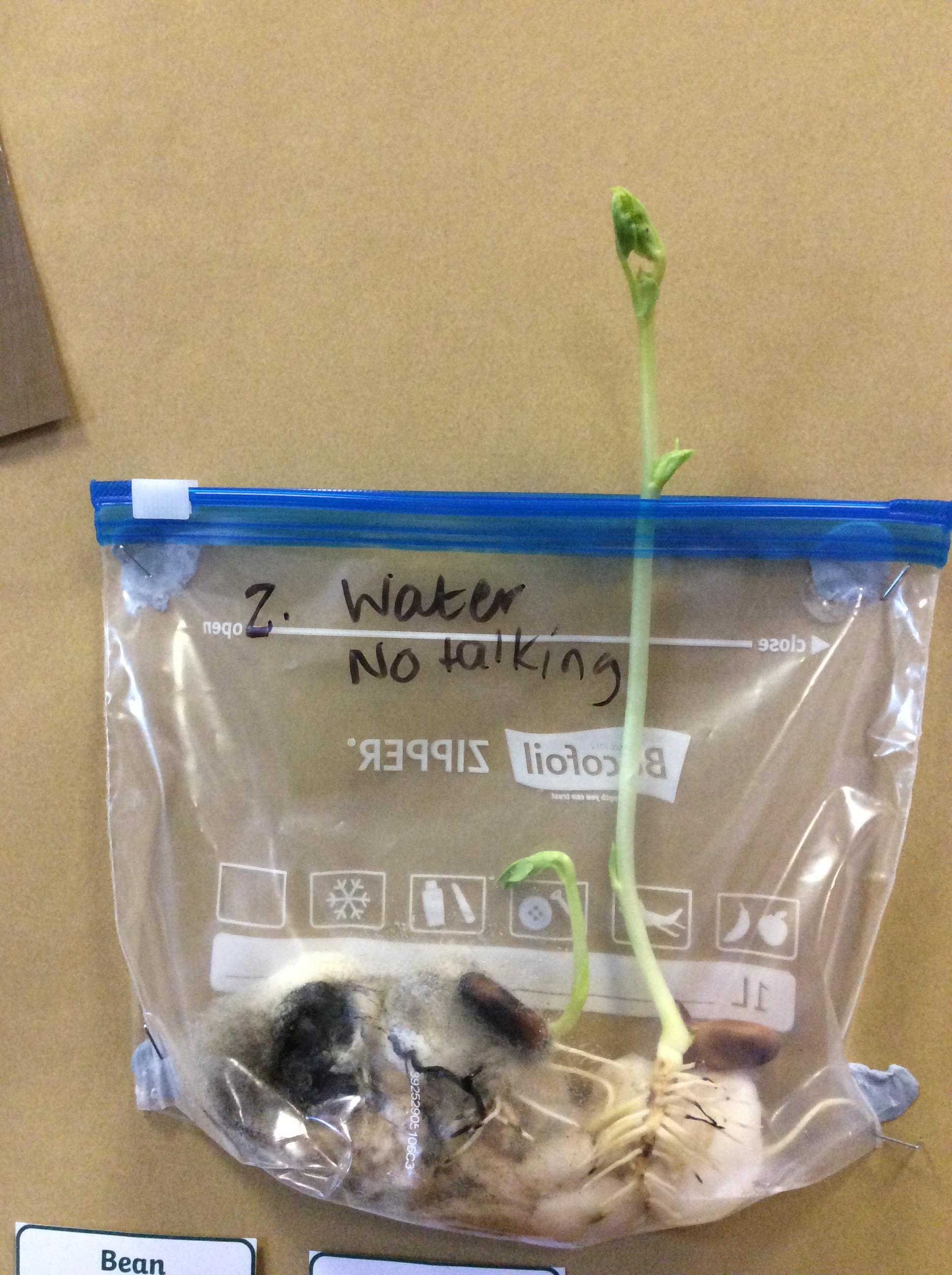 This led us to carry out a science experiment, where we planted some broad bean seeds and kept them in different conditions. Our first set of beans were watered and spoken to, the second set of beans were watered but not spoken to and our 3rd set of beans were not given any water or spoken to. We enjoyed watching them grow, well those that we watered and were fascinated when we saw the roots appear and then the shoots!